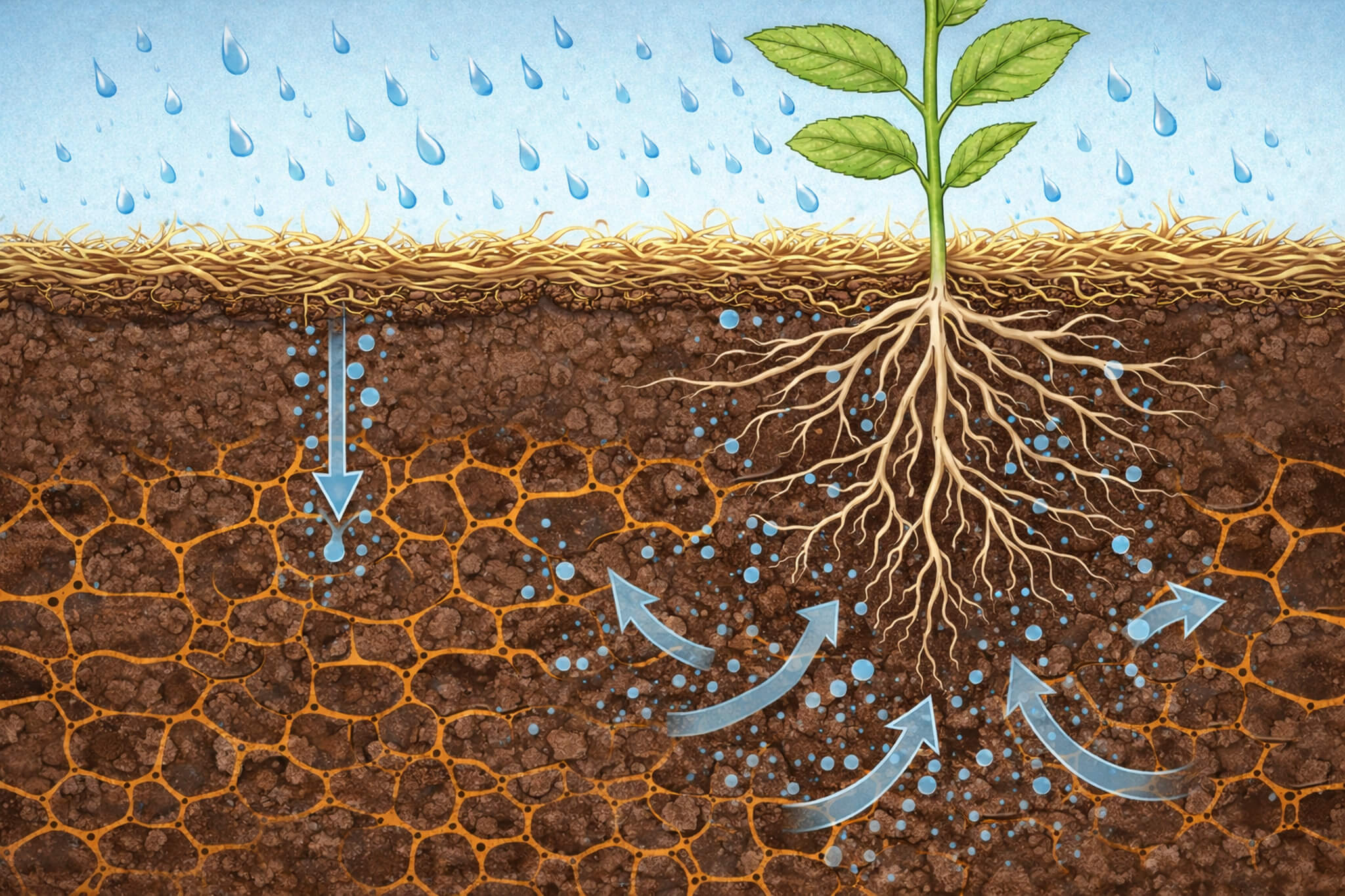 Základní výhodou přímého setí je zachování porézního systému půdy. Pokud půdu mechanicky nerozrušujeme, zůstávají zachované kapilární i nekapilární póry, které jsou zásadní pro dobrou infiltraci a vzlínání vody a pro výměnu půdního vzduchu. Půdní profil si tak udržuje přirozenou architekturu vytvořenou kořenovými systémy předplodin či meziplodin. Právě tyto kořenové kanálky a stabilní póry zvyšují infiltrační potenciál půdy a zlepšují hospodaření s vodou v období přebytku i nedostatku srážek.