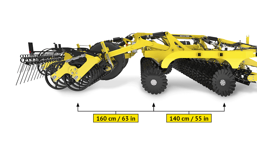 Dwurzędowy układ tylnych wałów zapewnia lepszą stabilność przy dużej prędkości niż konstrukcja jednorzędowa, a także eliminuje luki w kultywatorach tarczowych z dwoma wałami w jednym rzędzie. Zintegrowana oś zapewnia równomierne rozłożenie ciężaru maszyny i eliminuje jej kołysanie. Ponadto zapewnia bezpieczniejszy transport i zmniejsza promień skrętu ciągnika z kultywatorem na uwrociu.