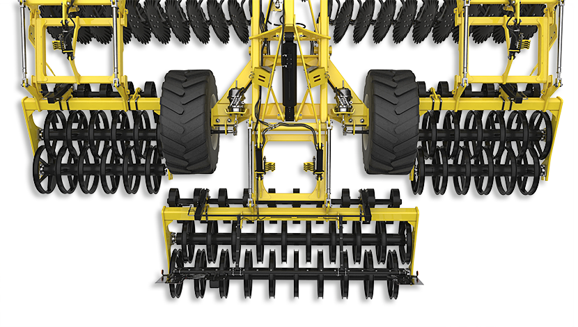 Dispunerea pe două rânduri a tăvălugilor posteriori oferă o stabilitate mai bună la viteze mari decât designul pe un singur rând și, de asemenea, elimină spațiul liber din grapa compactă cu doi tăvălugi pe un singur rând. Axul integrat asigură distribuirea uniformă a greutății utilajului și elimină balansul acesteia. Mai mult, asigură un transport mai sigur și reduce raza de virare a tractorului cu grapa la capătul rândului.