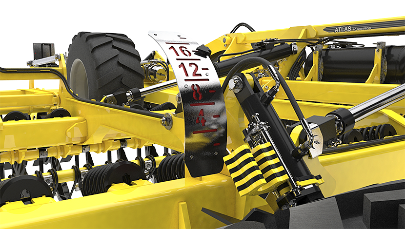 Grapa cu discuri ATLAS AO_PROFI GEN II este echipată cu reglare ușoară a adâncimii de lucru chiar și în versiunea sa de bază. Adâncimea de lucru se reglează hidraulic folosind distanțiere pe cilindrii hidraulici, care fac parte din cadrele cilindrilor posteriori. Adâncimea de lucru este foarte clar vizibilă din cabina tractorului pe scala de adâncime de lucru.