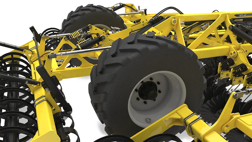 ATLAS AO_PROFI GEN II poate fi echipată cu roți de sprijin simple sau duble. Acestea garantează o urmărire excelentă a terenului și menținerea adâncimii de lucru setate pe întreaga lățime de lucru a utilajului.
