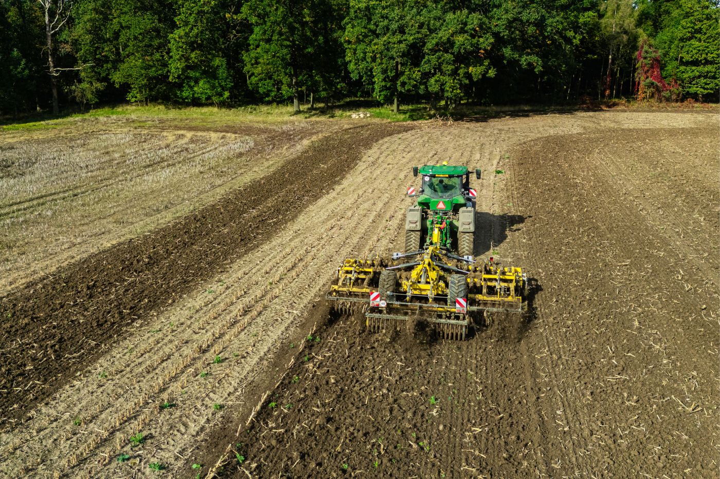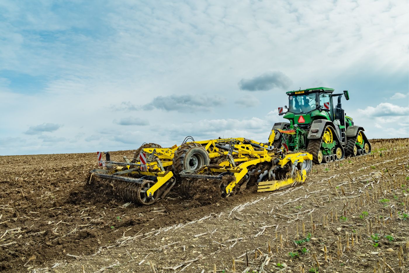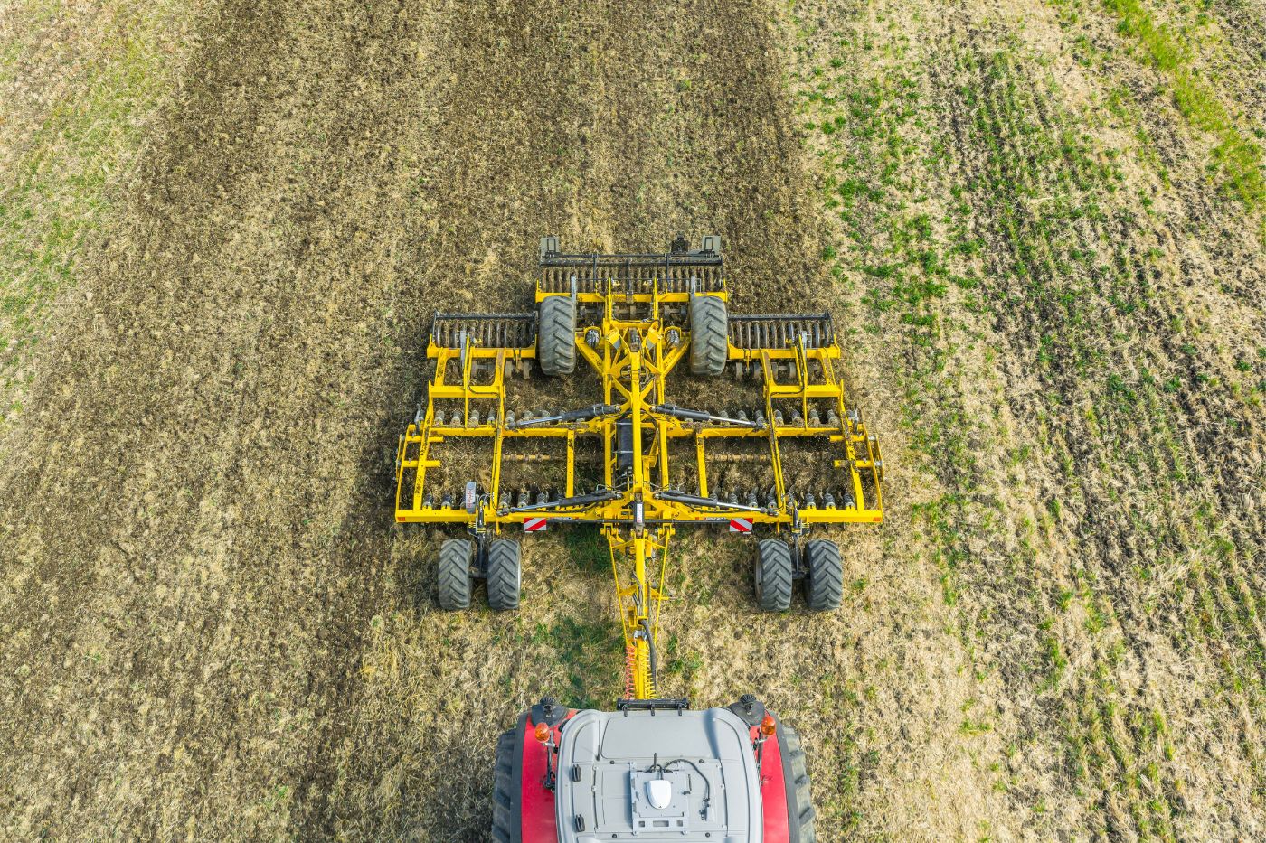 Asigură distribuirea uniformă a greutății utilajului, contribuie la o stabilitate mai bună și elimină riscul de balansare a utilajului la viteze de lucru mai mari. Un alt avantaj constă în raza de virare redusă la capătul rândului și manevrabilitatea ridicată, chiar și pe teren accidentat.
