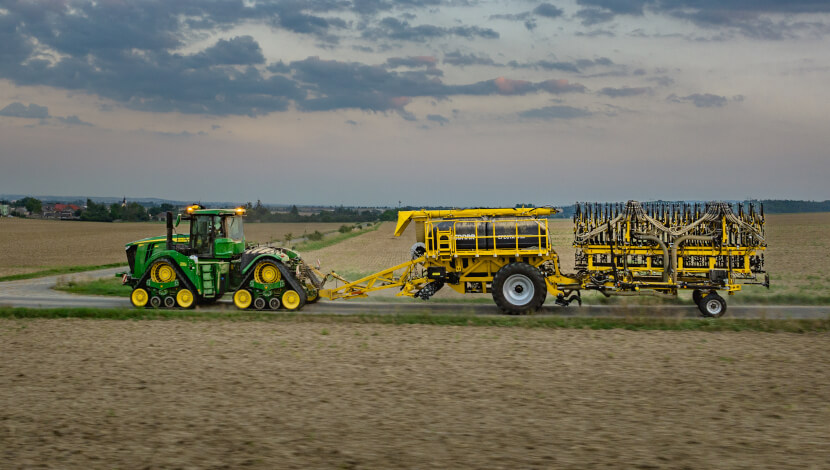 总容量为 12,000 升的大容量气推车。加压罐提高了种子配料精度。料斗按50:50的比例划分。